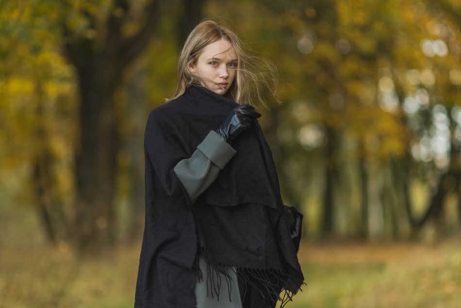 Dame med sort jakke med skjerf og sorte skinnhansker poserer med vind i håret utendørs.