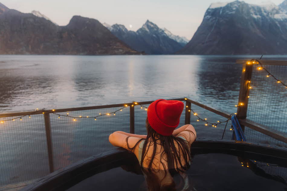 Dame med rød lue sett bakfra sittende i badestamp med fjord- og fjellandskap.