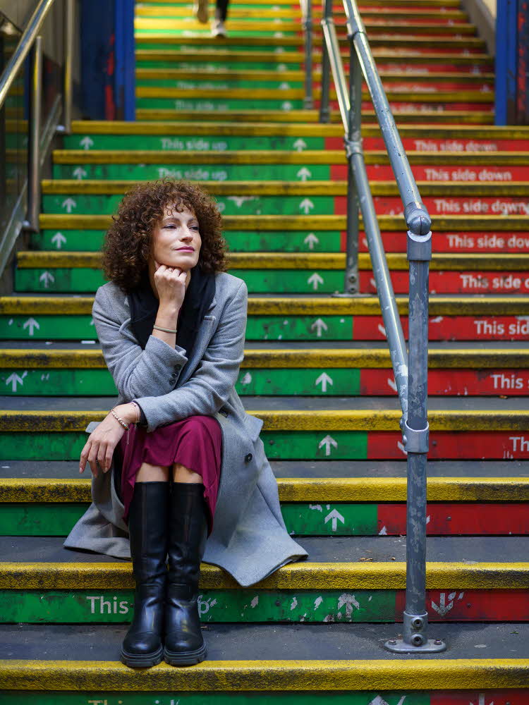 Dame med grå cardigan, burgunder skjørt og sorte knelange boots sitter i trapp og smiler.